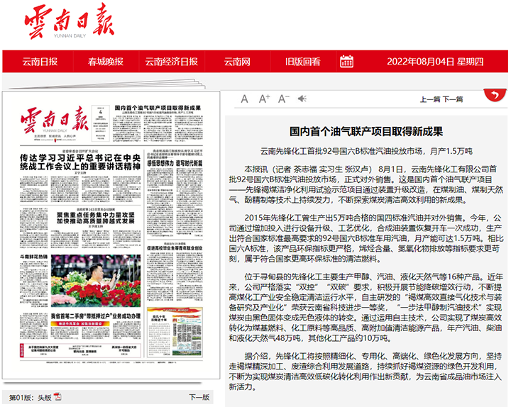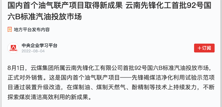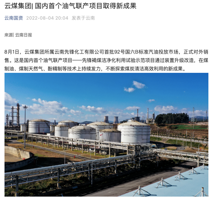 8月1日,云南先锋化工有限公司首批92号国六B标准汽油投放市场,正式对外销售。这是海内首个油气联产项目——先锋褐煤洁净化利用试验示范项目通过装置升级革新,在煤制油、煤制天然气、酚精制等技术上连续发力,不绝探索煤炭清洁高效利用的新结果。