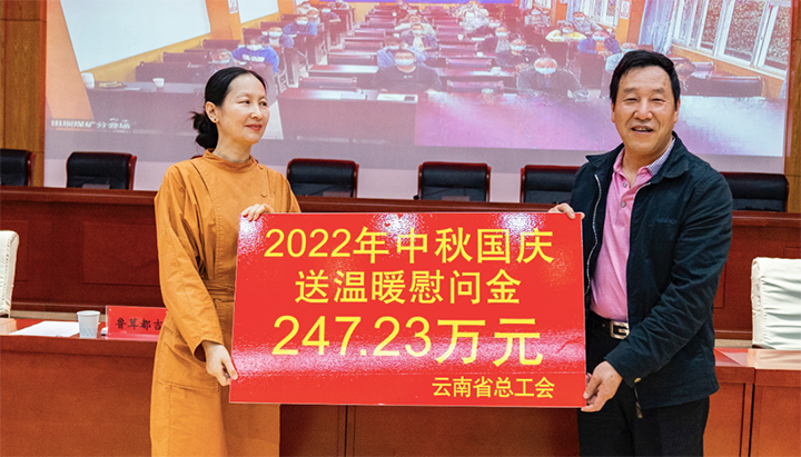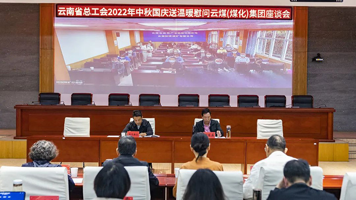 9月15日,云南省总工会兼职副主席、云南冶金昆明重工有限公司首席技师、省劳动模范协会会长耿家盛一行到集团开展以“喜迎二十大 佳节暖人心”为主题的2022年中秋国庆送温暖慰问运动。集团党委委员、财务总监莫晓丹,总部各部分、驻昆单位职工代表在集团总部主会场,田坝煤矿有限公司分会场的困难劳模、困难职工代表以视频形式加入慰问运动。