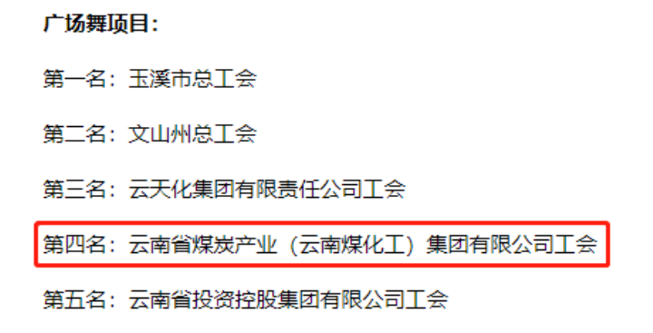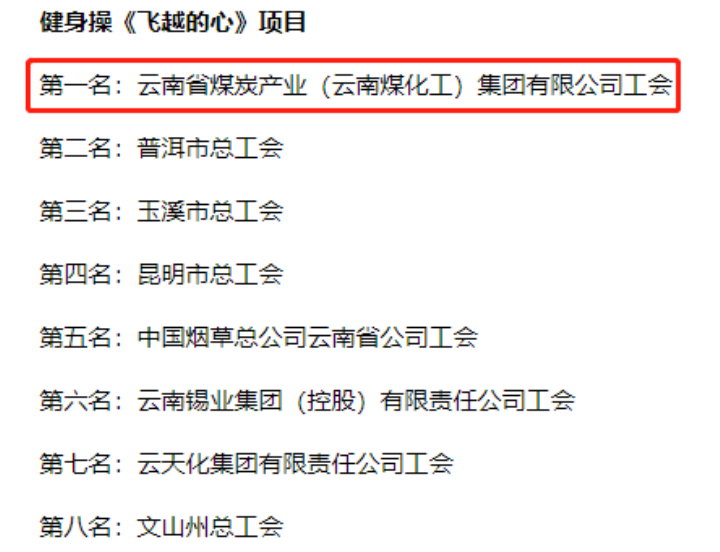 近日,由云南省体育局、云南省教育厅、云南省总工会联合主办,玉溪市人民政府承办的云南省第十六届运动会(职工组)健美操(线上赛)在昆明圆满收官。云煤(九游老哥俱乐部)集团工会选送的《飞越的心》和《欢喜中国欢喜家》划分荣获健身操飞越的心第一名和广场舞第四名。
