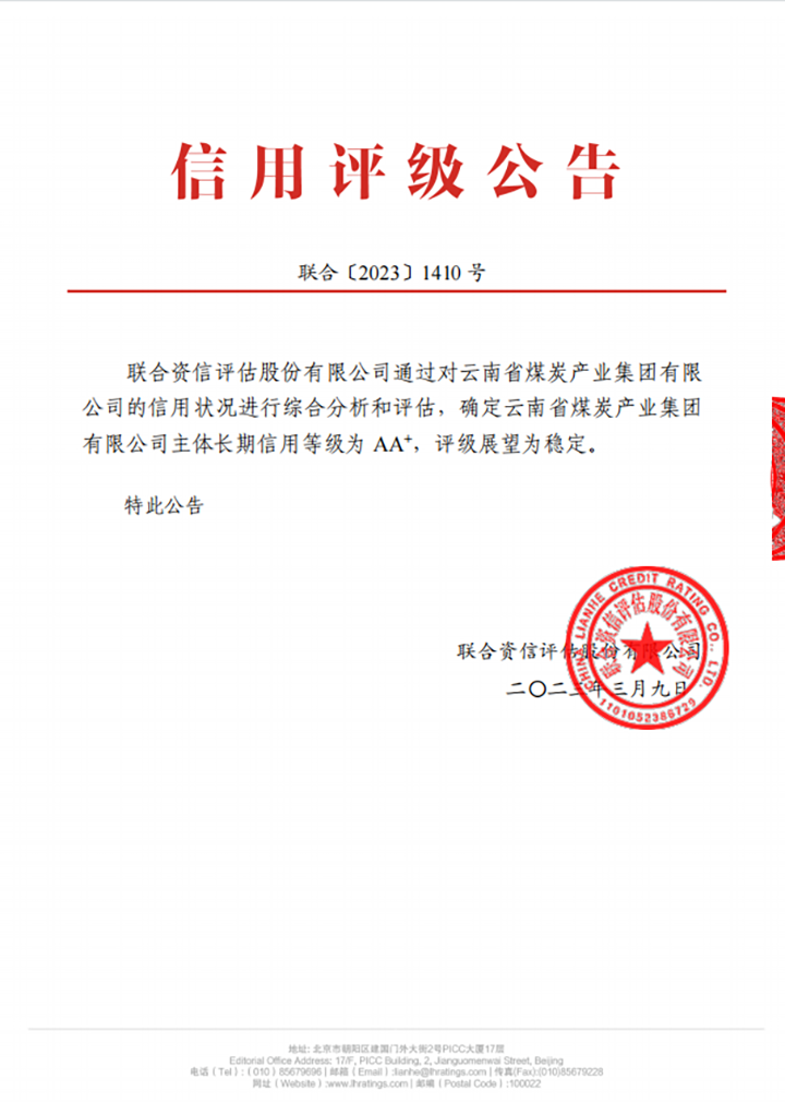 近日,基于对集团恒久信用水平的综合评估,云南省煤炭工业集团有限公司同时获得了海内评级机构联合资信评估公司、东方金诚评估公司给予的主体恒久信用品级AA+,评级展望为稳定。集团的综合实力和主体恒久信用水平获得了市场机构的充分肯定和认可,将对集团可连续生长、高质量生长,以及在海内果真市场刊行项目打下坚实的基础。