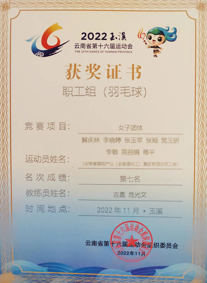 四年一届的省运会由云南省体育局、云南省教育厅、云南省总工会主办,玉溪市人民政府承办。集团加入了职工组篮球、羽毛球、乒乓球、气排球、健身操五个项目,共有81名运发动和12名教练员加入角逐。集团工会选送的《飞越的心》和《欢喜中国欢喜家》划分荣获健身操飞越的心第一名和广场舞第四名,解化分公司周洁获个人“品德民俗奖”;篮球项目在38支代表队中获得团体第十九名,国家矿山应抢救援东源队秦敬获个人“品德民俗奖”;羽毛球项目获得女团第五名,曲煤焦化公司王俊、云煤矿业公司李晓婷获个人“品德民俗奖”;先锋化工李天翠、解化分公司陈治宇获乒乓球项目个人“品德民俗奖”;曲煤焦化公司高伟刚、解化分公司丁娅获气排球项目个人“品德民俗奖”。