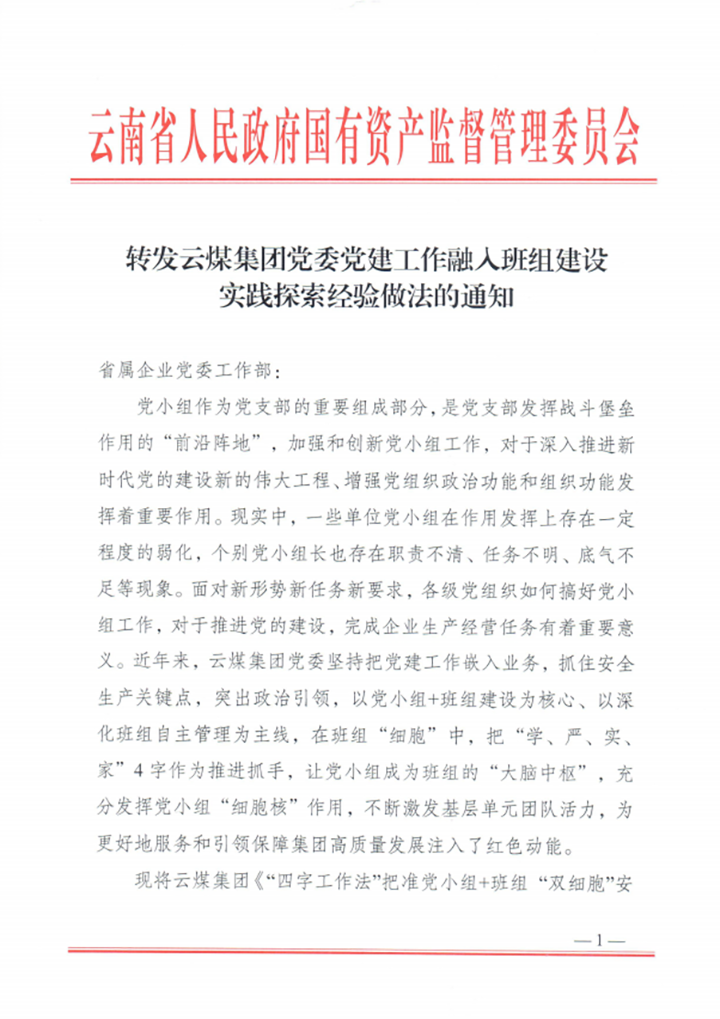 通知的附件《“四字事情法”把准党小组+班组 “双细胞”宁静治理“脉搏”——云煤集团党委党建事情融入班组建设实践探索》也随通知一并宣布。