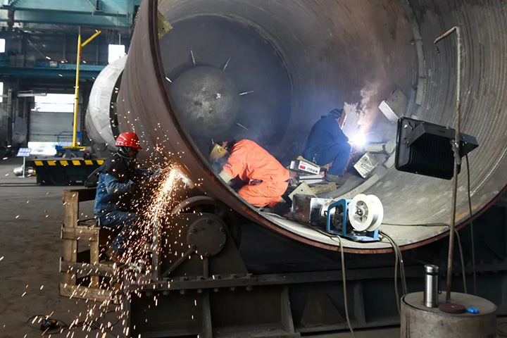 走进公司生产区,从1号到5号厂房,随处都是忙碌的身影,大锤的敲打声、磨光机的打磨声、机械的轰鸣声,气刨和电焊的火花与弧光交织,泛起出一幅热火朝天的实干画卷。