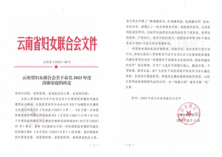 点赞!宋维家庭荣获2023年度云南省“清廉家庭”