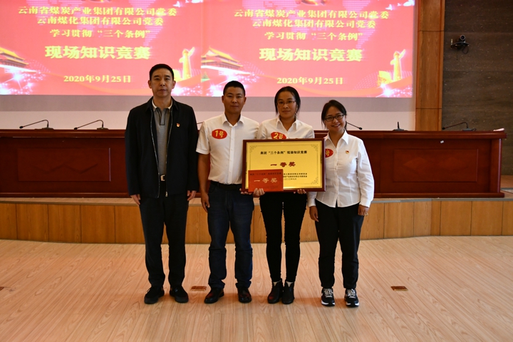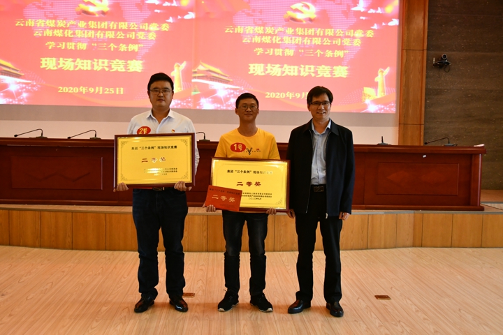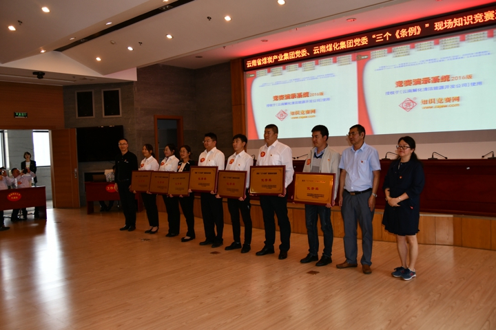 本次知识竞赛分为预赛和决赛两个阶段。预赛中,经过对所属党组织37支代表队的严格选拔,云维集团、解化清洁能源公司、曲煤焦化实业公司等13支参赛代表队脱颖而出进入决赛。在决赛现场,各代表队冷静应对、竞相追逐,充分展示了集团下层单位党员学习掌握“三个条例”的娴熟能力,同时也彰显了各代表队良好的团队精神和高昂的精神状态。角逐现场,观众积极加入互动,气氛紧张热烈。通过一个下午的角逐,最终陆东煤矿代表队获得本次知识竞赛一等奖,镇雄煤业公司、田坝煤矿代表队获得二等奖,云维集团、解化清洁能源公司和可保煤矿有限公司代表队获得三等奖。集团党委副书记、工会主席王鑫、党委事情与人力资源部和纪委的相关部分领导为获得“三个一”知识竞赛奖项的参赛代表队颁奖。